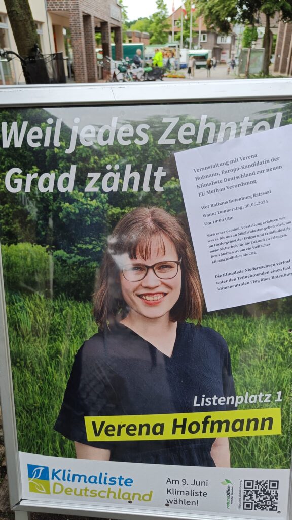 Am 30.05.2024 traf die EU-Spitzen Kandidatin der Klimaliste Deutschland in Rotenburg W. an und machte mit dem Landesvorstand der Klimaliste Niedersachsen und dem Bundesvorsitzenden eine Gastour, bei der sie verschiedende Standorte der Erdgasförderung besichtigten.